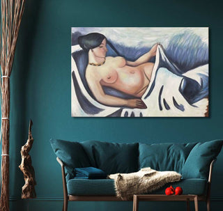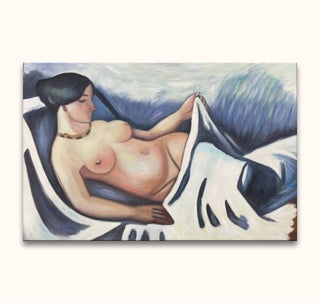 Handgemaltes Gemälde Liegende Frau von August Macke. Hochwertiges Ölgemälde, das eine Frau in lebendigen Farben durch moderne Malerei darstellt.