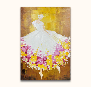 Das Gemälde besteht aus zwei meisterhaften Schichten: einem kubistischen Hintergrund, der den Frühlingshimmel darstellt, und einem Vordergrund mit einer pastellfarbenen Ballerina, die mit dicker Ölfarbe spielerisch akzentuiert ist.