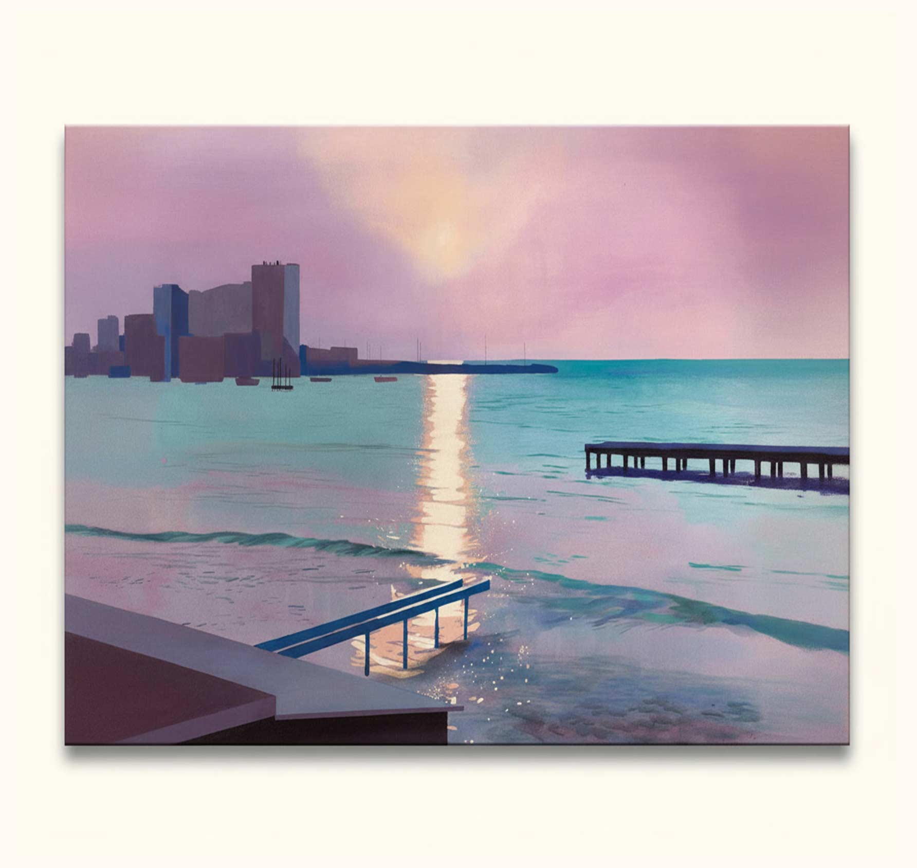 Handgemaltes Gemälde „Early Morning in Sainte Maxime“ - David Hockney Signatur. Hochwertiges Ölgemälde, das den Strand von Sainte Maxime in moderner Malerei darstellt.