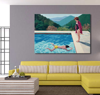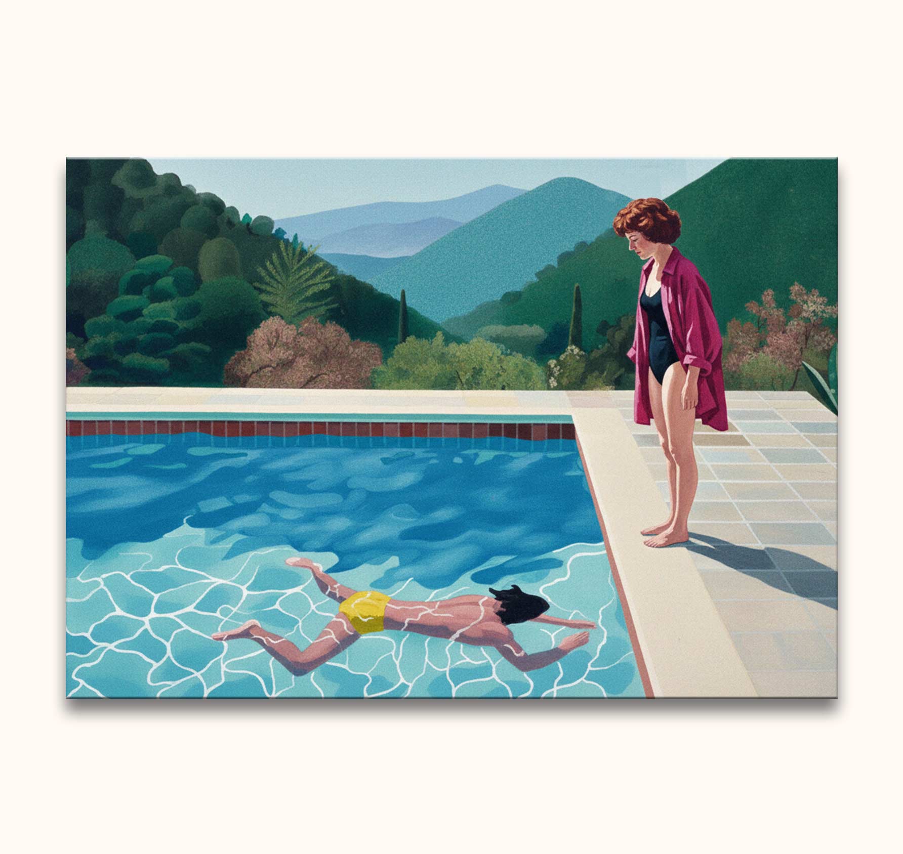 Handgemaltes Gemälde Pool with Two Figures - David Hockney Signatur. Hochwertiges Ölgemälde mit Darstellung zweier Männer an einem Swimmingpool durch moderne Malerei.
