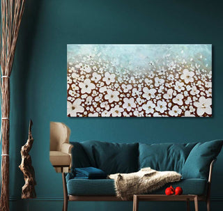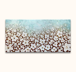 Das Gemälde besteht aus zwei meisterhaften Schichten: einem rustikalen pastellblauen Hintergrund, der den Frühlingshimmel darstellt, und einem Vordergrund mit klassischen weißen Blütenblättern, der mit dicker Ölfarbe spielerisch akzentuiert wird.