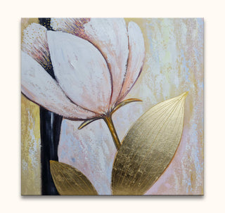 Handgemaltes Gemälde Goldene Tulpe. Hochwertiges Ölgemälde mit Darstellung einer blühenden goldenen und weißen Tulpe durch moderne Spachtelmalerei.
