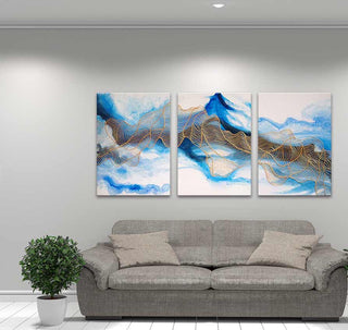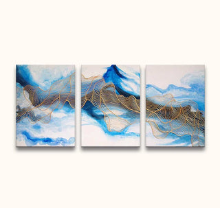 Handgemaltes 3-Panel-Gemälde Golden Web. Hochwertiges Acrylgemälde mit Darstellung einer goldenen Netzstruktur auf weißen und azurblauen Farbtönen durch moderne Malerei.