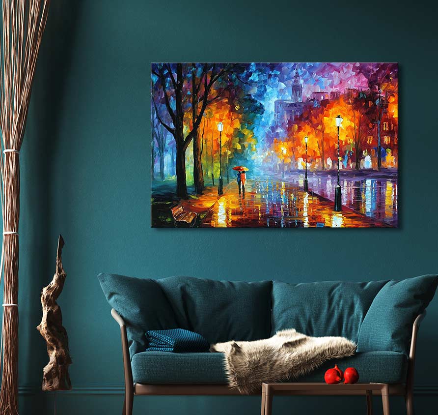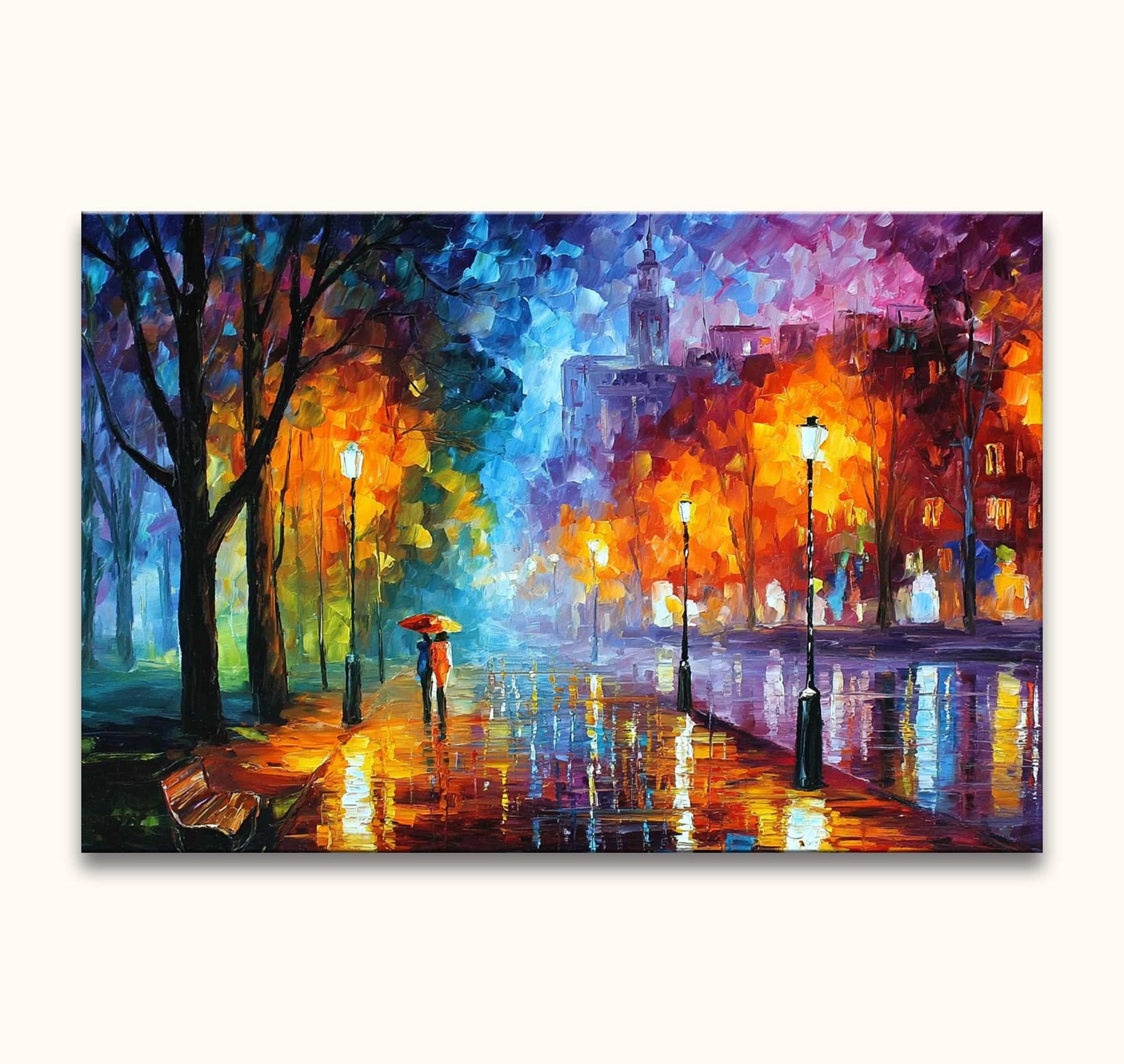 Original handgemaltes Gemälde „Herbstlicht“ im Stil von Leonid Afremov, von Großmeistern. Dieses hochwertige, moderne Ölgemälde fängt die einzigartige Schönheit regnerischer Herbstabende durch impressionistische Malerei ein. Dies ist ein Originalwerk, das vom Stil Leonid Afremovs inspiriert ist, und keine Reproduktion.