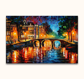 Handgemaltes Ölgemälde „Brücke über die Prinsengracht“ – Leonid Afremov Signatur. Dieses hochwertige, moderne Ölgemälde fängt die einzigartige Schönheit der Prinsengracht in Amsterdam durch impressionistische Malerei ein.