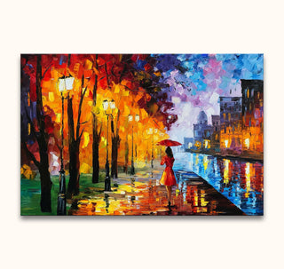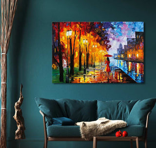 Original handgemaltes Gemälde „Stadt am See“ im Stil von Leonid Afremov, von Großmeistern. Ein modernes, hochwertiges Ölgemälde, das die einzigartige Schönheit des Herbstregens durch impressionistische Malerei darstellt. Dies ist ein Originalwerk, das vom Stil Leonid Afremovs inspiriert ist, und keine Reproduktion.