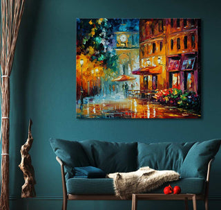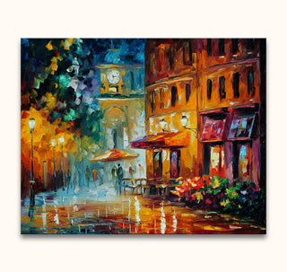 Handgemaltes Ölgemälde „Feierabend“ – Leonid Afremovs Signatur. Dieses hochwertige, moderne Ölgemälde fängt die einzigartige Schönheit einer Straße durch impressionistische Malerei ein.