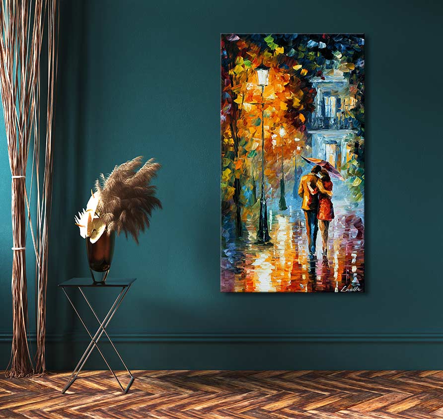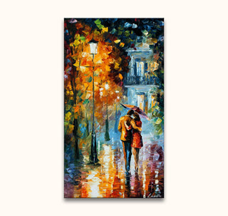 Handgemaltes Ölgemälde „Kleines Geheimnis“ – Leonid Afremov Signatur. Dieses hochwertige, moderne Ölgemälde stellt die einzigartige Schönheit eines Mannes und einer Frau durch impressionistische Malerei dar.