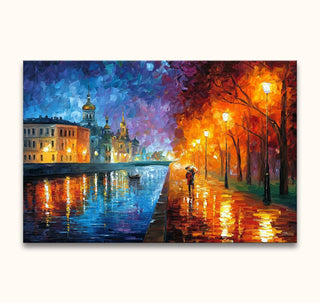 Handgemaltes Ölgemälde „Liebe aus Sankt Petersburg“ – Leonid Afremov Signatur. Dieses hochwertige, moderne Ölgemälde fängt die einzigartige Schönheit eines verregneten Sankt Petersburg durch impressionistische Malerei ein.