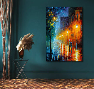Handgemaltes Ölgemälde „Geheimnisvoller Abend“ – Leonid Afremov Signatur. Hochwertiges, modernes Ölgemälde, das die einzigartige Schönheit einer Straße durch impressionistische Malerei darstellt.