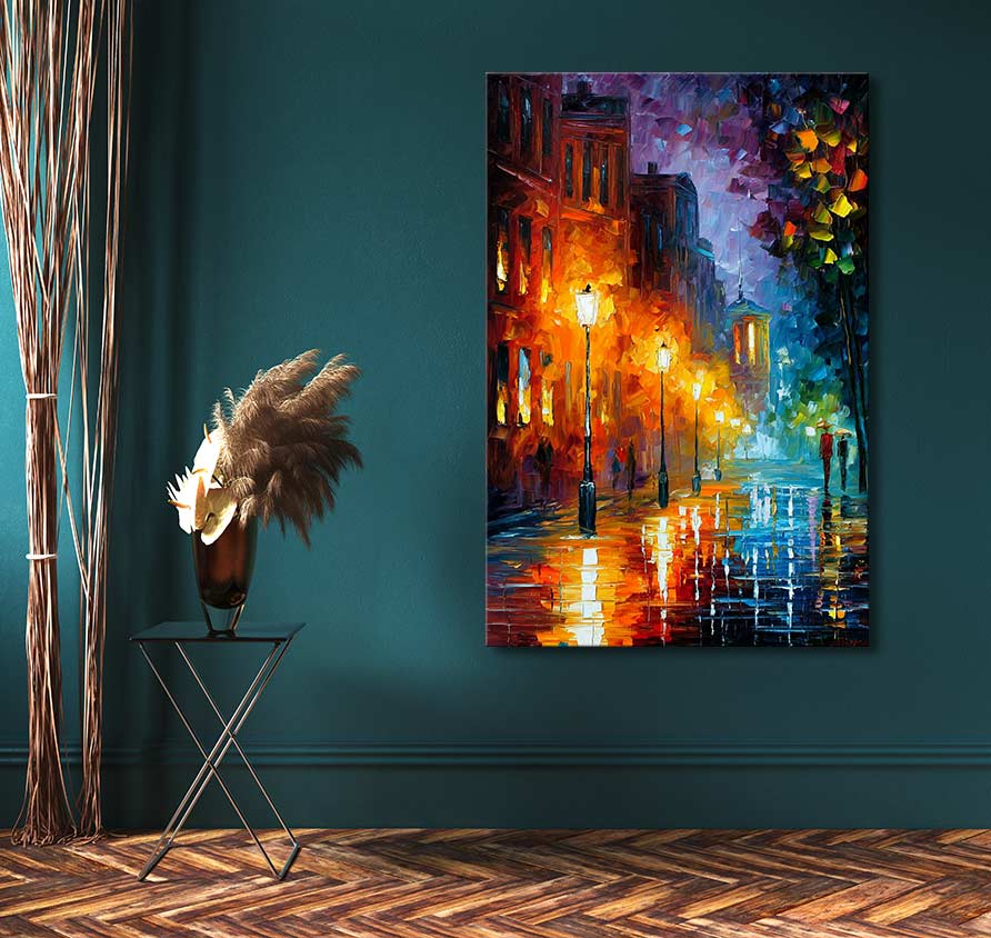 Original handgemaltes Gemälde „Mysteriöse Nacht“ im Stil von Leonid Afremov, von Großmeistern. Ein modernes, hochwertiges Ölgemälde, das die einzigartige Schönheit einer Straße durch impressionistische Malerei einfängt. Dies ist ein Originalwerk, das vom Stil Leonid Afremovs inspiriert ist, und keine Reproduktion.