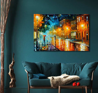 Handgemaltes Ölgemälde „Zwei verlorene Seelen“ – Leonid Afremov Signatur. Dieses hochwertige, moderne Ölgemälde fängt die einzigartige Schönheit einer verregneten Straße durch impressionistische Malerei ein.