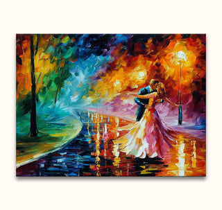 Handgemaltes Ölgemälde „Kreuzung in einem Walzer in einem Parkpanorama“ – Leonid Afremov Signatur. Dieses hochwertige, moderne Ölgemälde fängt die einzigartige Schönheit eines tanzenden Paares durch impressionistische Malerei ein.