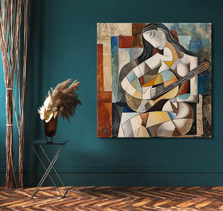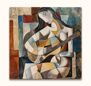 Handgemaltes Gemälde Ranucia spielt Gitarre - Pablo Picasso-Signatur. Hochwertiges modernes abstraktes Ölgemälde, das Ranucia, eine Freundin von Picasso, durch kubistische Malerei darstellt.