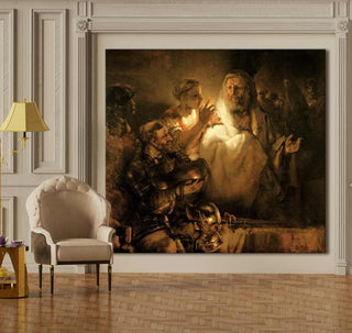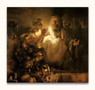 Handgemaltes Ölgemälde „Die Verleugnung des Petrus“ von Rembrandt van Rijn. Hochwertiges Ölgemälde, das die Verleugnung von Petrus durch klassische Malerei darstellt.